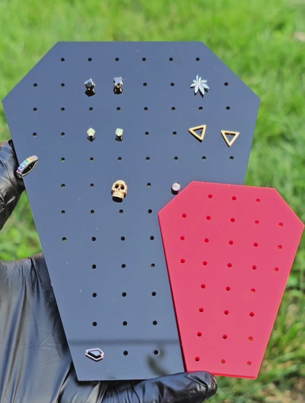 Keep your earrings safe and stylishly organized while on the go with our unique coffin-shaped earring organizer, crafted from durable acrylic. Designed for both flat-back studs and dangles, this organizer is a must-have for any jewelry enthusiast who travels frequently.