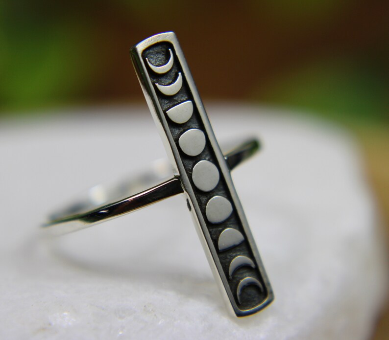 Sterling silver nine phases of the moon, with a full moon at the center, on an oxidized background, highlighting the design by its contrast.